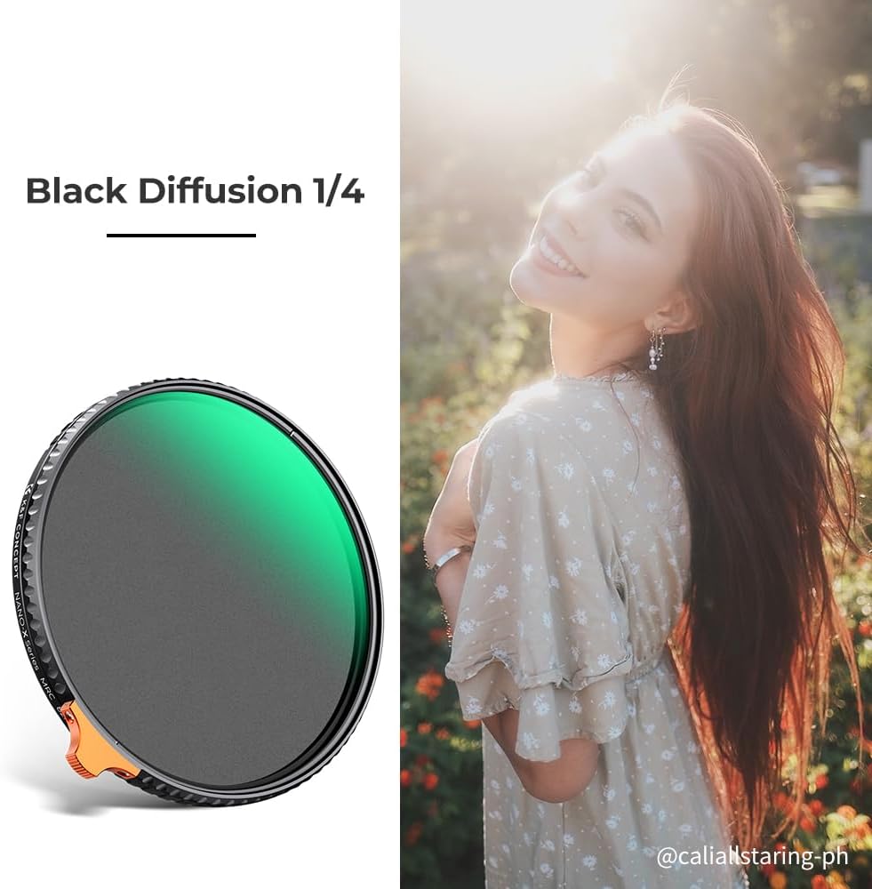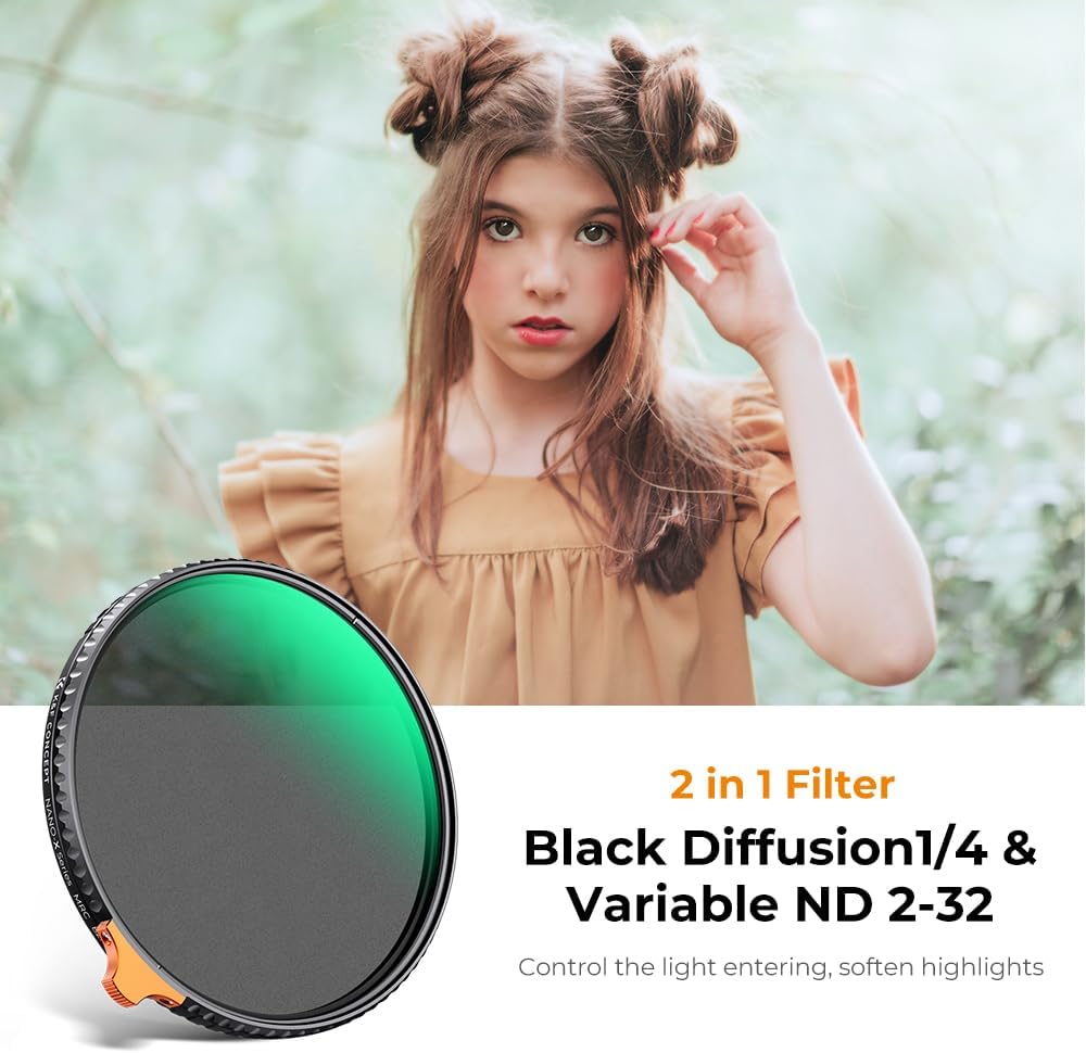 - 【Variable ND2-ND32 & Black Diffusion Filter1/4 Function 2 in 1】One filter both have the variable ND & black diffusion 1/4 effect filter features, it not only can control the amount of light entering the lens via adjusting (1-5 stops ) but also creates a cinematic dream effect for photos and video. Old and new packaging will be distributed randomly, with no changes to the product contents.
